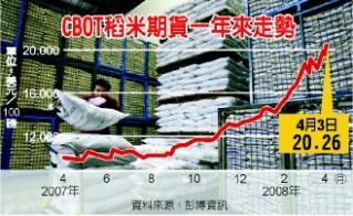 芝加哥期貨交易所(CBOT)5月交貨的稻米期貨價格,3日漲至每100磅20.26美元的歷史高價,主因是聯合國糧食及農業組織(FAO)說,受到數個國家管制出口影響,全球稻米出口今年將減少3.5%。