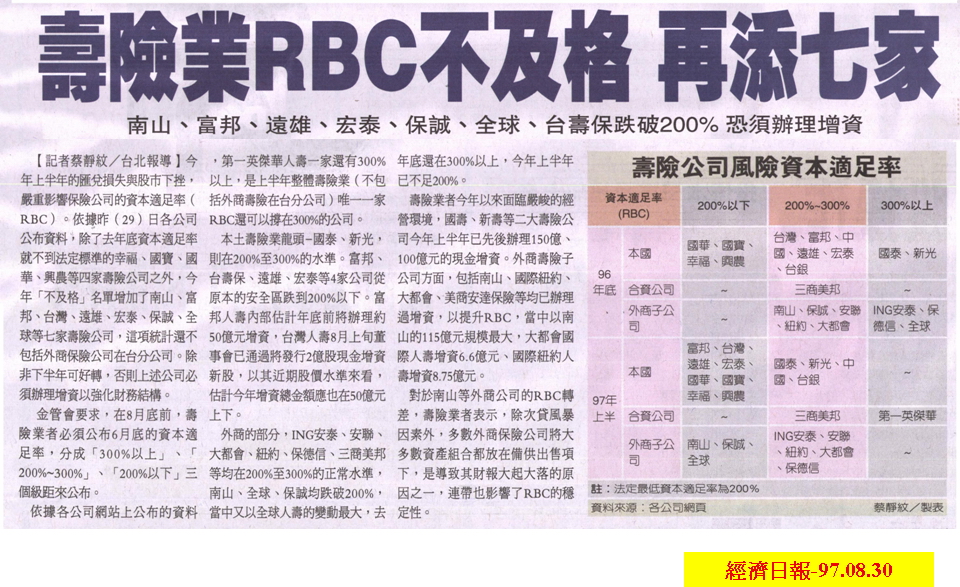 「南山 富邦 遠雄 宏泰 保誠 全球 台壽保 跌破200% 恐須辦理增資」