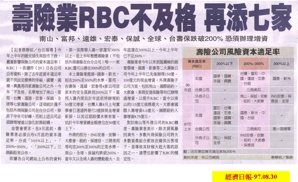 而 RBC指標,最簡單的敘述就是評估這保險公司的資金營運好壞,不足200%以下的話,必須被罰以增資的要求。